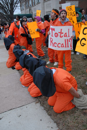 At the rallying points, organizers distributed pre-made signs, buttons bearing the slogan “No Torture” and over 75 orange jumpsuits.