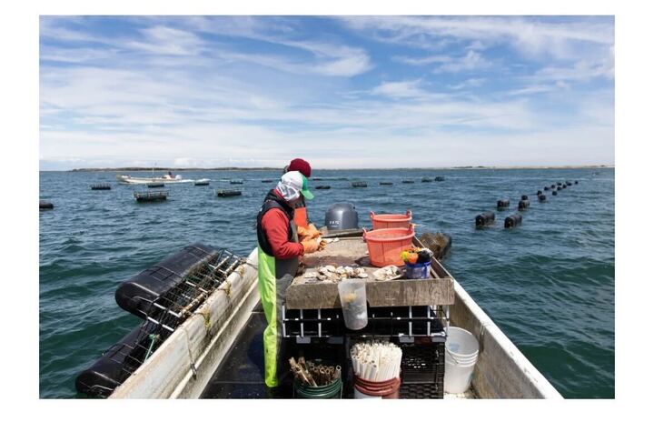 People cleaning oysters on a boat for Grey Lady Oysters, the company Gus Bachner worked for this summer. (Photo courtesy of Grey Lady Oysters)