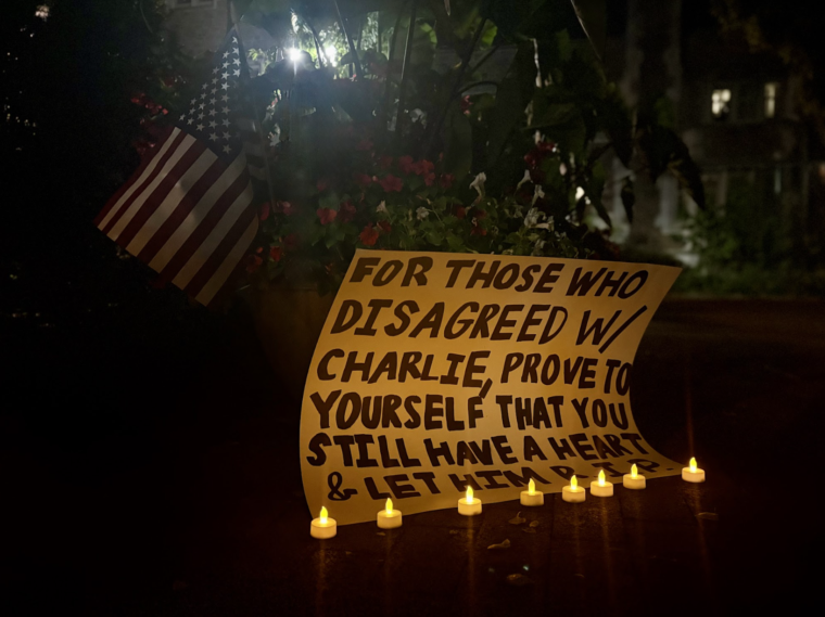 The vigil took place next to a small memorial, consisting of three dozen small tealights, an American flag, and two signs. One sign remembered Kirk as a husband, father, and patriot, and the other left a message for the WashU community: “For those who disagreed with Charlie, prove to yourself that you still have a heart and let him R.I.P.”