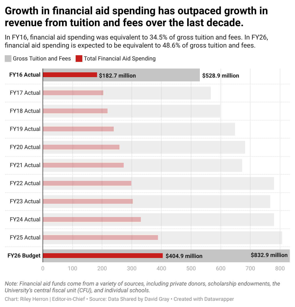 WashU’s financial aid spending has outpaced the increase in revenue from gross tuition and fees over the last 10 years, according to data shared by Gray. WashU’s gross tuition and fees increased from $528.9 million in Fiscal Year 2016 (FY16) to $832.9 million in Fiscal Year 2026 (FY26). At the same time, financial aid has more than doubled, going from $182.7 million in FY16 to over $400 million in FY26.