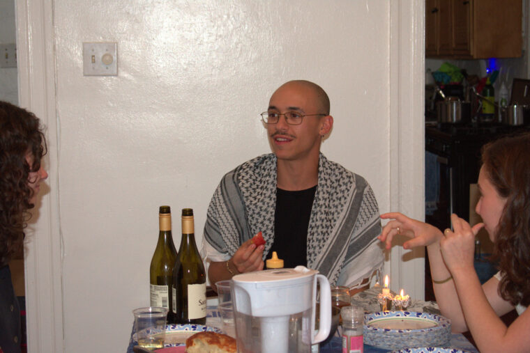 Schreiber sits at a Rosh Hashanah dinner while wearing a keffiyeh, a traditional Palestinian headdress. (Courtesy of Sonya Koffman)
